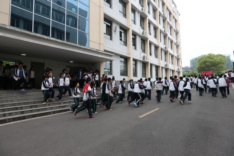 “同学们请注意,教学楼发生火灾,请全体同学在老师的引导下迅速有序撤离……”下午3时整,一阵急促尖锐刺耳的警报声突然打破寂静,听到骤响的警铃,学生们纷纷快速、有序地离开教室,冲向教学楼外空旷的操场,从警报铃声响起到最后一位学生撤离,近千名师生安全地撤离到操场,整个演练用时仅仅2分钟。