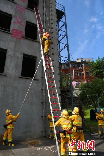 消防队员们进行百米冲刺登楼训练 王申 摄