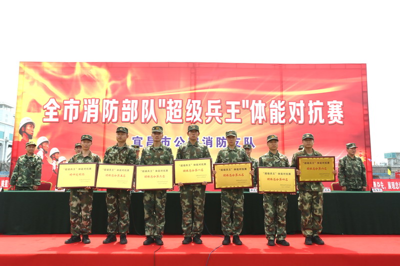 5月25日,宜昌消防支队为期三天的“超级兵王”体能对抗赛圆满落幕,全市消防部队18个执勤中队共108名官兵参加比赛。最终,特勤、西陵、夷陵、伍家、东山、左岸消防中队分获前六名。据悉,此次比赛共设置100米短跑、4×400米接力跑、实装负重登山、3人扛圆木跑300米、3000米跑、400米障碍共计六个科目。